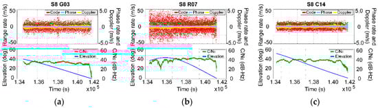 Comparison of the pseudorange rate, phase rate, and Doppler data from smartphones. (a) The number 3 satellite of GPS (G03); (b) the number 7 satellite of GLONASS (R07); (c) the number 14 satellite of BDS (C14).