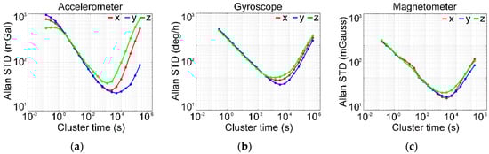 Allan standard deviation (STD) value of accelerometer (a), gyroscope (b), and magnetometer (c) data.