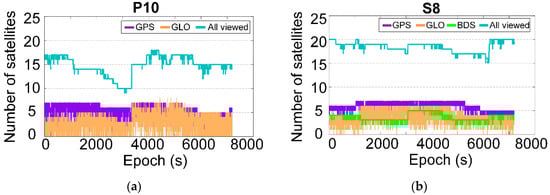 In this experiment, the GNSS observations of P10 and S8 smartphones are processed with the proposed algorithm as shown in Figure 4, where the pure GNSS model is selected. Figure 11 shows the number of GPS, GLONASS, and BDS satellites viewed. For the S8 smartphone, there are about 19 visible GNSS satellites, while it declines to 15 for the P10, due to the absence of BDS. After error detection, only five to seven GPS satellites were found to be used in the positioning process, and there were about two to four GLONASS satellites and three BDS satellites added for the GNSS positioning process.