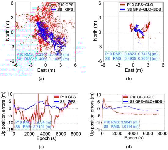 (a,b) are the comparison of GPS and GNSS (GPS, GLONASS, and BDS) horizontal position errors; (c,d) are the vertical position errors for smartphone S8 and P10, respectively.