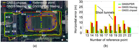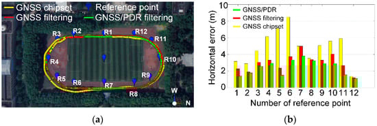 (a) is the comparison of the kinematic track; (b) is their horizontal position errors using three different methods, including the original positioning results of the smartphone GNSS chipset shown by the yellow line, the GNSS positioning only results shown by the red line, and the GNSS/PDR fusion results shown by the green line.