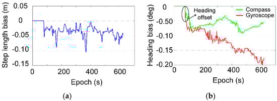 (a) is the step length bias of PDR; (b) is the heading bias. The step length and heading bias are estimated by the displacement of the time-differenced carrier phase (TDCP).