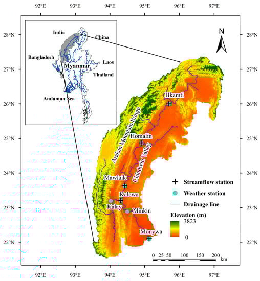 The Chindwin River basin is located in the northwestern part of Myanmar within the latitude of 21.6°–27.4°N and longitude of 93.5°–97.3°E (Figure 1). The river has a drainage area of 110,350 km2 and a length of 985 km. The Chindwin River basin is mainly characterized by a complex mountainous terrain (the Arakan Mountain Range) in the north and west, and the wide Chindwin Valley at its central and southern parts (Figure 1). The basin is situated in subtropical and tropical climate regions and has distinct humid and dry seasons controlled by monsoon systems. The southwest monsoon season begins in June and ends in September, with a rainy and hot summer. The northeast monsoon prevails from December to April, leading to the dry and cool season. Precipitation is highly spatially uneven due to the effects of complex topography and the southwest monsoon. The mean annual precipitation tends to decline sharply from the north (approximately 3700 mm) to the south (approximately 750 mm) [47]. The basin suffers from severe floods every year, and floods occur most frequently and seriously in July and August, contributing 72% of the total number of flood events because of the high rainfall intensities with considerable spatiotemporal variations in the southwest monsoon season [47,59,60,61,62]. Severe flood disasters cause enormous damage to the local society, leading to serious threats to people’s lives, property, and safety. Thus, predicting and monitoring flood risks and employing effective prevention measures are urgent and necessary. However, the local rainfall-monitoring network is sparse, with a density of 0.63 rain gauge per 10,000 km2, which hampers the accuracy of flood forecasting. Therefore, adopting SPPs on fine spatiotemporal resolutions as supplementary precipitation data sources is a promising approach for effective flood simulation and timely flood forecasting.