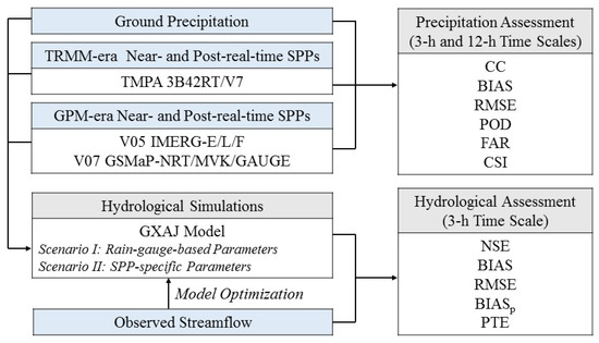 Based on the findings of statistical evaluations of multiple SPPs against the ground precipitation observations, the comparatively better SPPs in near- and post-real-time versions were selected to drive the GXAJ model for 3-hourly streamflow simulations. The hydrological performance of these SPPs was evaluated according to two model setup scenarios.