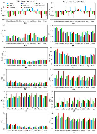 Figure 4c,d show that the CC values of the 3-hourly daytime precipitation estimates from all eight SPPs are generally lower than those of the 12-hourly nighttime precipitation retrievals. The three IMERG SPPs obtain slightly higher CC values than their predecessor—that is, TMPA products—at most rain gauges. The averaged CCs for the 3-hourly daytime precipitation estimates from IMERG-E, IMERG-L, and IMERG-F are 0.387, 0.412, and 0.400, respectively, while those for 3B42RT and 3B42V7 are 0.376 and 0.361, respectively. In the case of the 12-hourly nighttime precipitation retrievals, the mean CCs increase to 0.556, 0.588, and 0.593 for IMERG-E, IMERG-L, and IMERG-F, respectively, and those for 3B42RT and 3B42V7 are 0.547 and 0.554, respectively. GSMaP-MVK has the highest averaged CC (0.416) for daytime precipitation estimation, but the CC values of GSMaP-NRT and GSMaP-GAUGE are relatively low (0.341 and 0.367, respectively). On average, all three GSMaP-based 12-hourly nighttime precipitation time series are in poorer correlations with the ground observations than TMPA and IMERG, which have mean CC values of 0.472, 0.510, and 0.486 for GSMaP-NRT, GSMaP-MVK, and GSMaP-GAUGE, respectively.