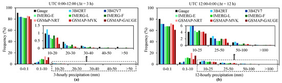 Figure 5 compares the histograms of the eight SPPs at the locations of the seven stations in the Chindwin River basin according to the ground observations for daytime and nighttime slots. Figure 5a shows that approximately 91.1% of the observed 3-hourly daytime precipitation data samples are under 0.1 mm, and all SPPs underestimate this frequency by 6.5–10.4%. All SPPs present an overestimation for 3-hourly daytime precipitation ranging from 0.1 mm to 10 mm. In particular, GSMaP-NRT and GSMaP-GAUGE provide evident overestimations of 11.3% and 9.8%, respectively, and 3B42RT and 3B42V7 are in slight overestimations of 1.0% and 2.1%, respectively. Nearly all products underestimate the occurrence frequency of daytime precipitation between 10 and 20 mm, except for 3B42RT with a mild overestimation of 0.2%. In addition, Figure 5a illustrates that an underestimation of 3-hourly daytime precipitation that exceeds 20 mm is found in all SPPs. All these observations indicate that the eight SPPs in this study tend to underestimate the occurrence frequencies of non-rain and heavy rain events and overestimate light and moderate rain events. A similar finding is also indicated in the 12-hourly satellite nighttime precipitation estimates (Figure 5b).