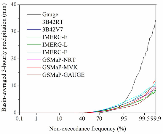In addition, the non-exceedance frequency distributions of the basin-averaged precipitation estimates from the eight SPPs were compared with those of the gauge-based data set on 3-h temporal scales. Figure 7 shows that all SPPs significantly underestimate the basin-averaged precipitation at the high quantile levels (≥87.2–95.3%) and clearly overestimate the intermediate precipitation quantiles at the levels of 45.6–87.2%. The reason is that all SPPs at the grid scale tend to overestimate the occurrence frequency of light and moderate rain events and largely underestimate the frequency of heavy rain events (Figure 5). This satellite-derived basin-averaged precipitation estimate feature would likely greatly influence the discharge simulations, particularly high-flow simulations, when these SPPs are adopted as the forcings of a hydrological model.
