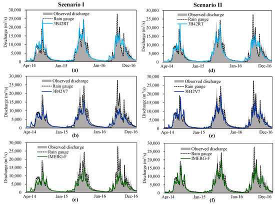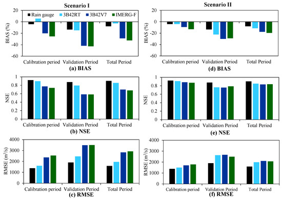 The GXAJ model was recalibrated using 3B42RT, 3B42V7, and IMERG-F SPPs to further assess the hydrological utilities of these SPPs. Figure 8 and Figure 9 demonstrate that model recalibration effectively improves most SPP-based discharge simulations at the Monywa station in the calibration and validation periods. The only exception is the 3B42RT-forced model run. The 3B42RT-based recalibration improves streamflow simulation in the calibration period but slightly worsens it in the validation period. Its BIAS, NSE, and RMSE values for the entire simulation period are 9.2%, 0.868, and 1937.5 m3/s, respectively (Figure 9d–f), which are slightly worse than those under Scenario I (Figure 9a–c). The 3B42V7-specific model calibration alleviates streamflow underestimation under Scenario I and improves the high-flow simulation (Figure 8a,d), which reduces BIAS and RMSE from −27.4% and 2965.8 m3/s to −18.9% and 2209.6 m3/s, respectively, and increases NSE from 0.690 to 0.828 in the entire simulation period (Figure 9). Such improvement is also found in the IMERG-F-based model run. BIAS is reduced from −32.3% under Scenario I to −18.5% under Scenario II, and RMSE for the entire period is cut down by 30.9%, and NSE is remarkably increased from 0.664 to 0.840 (Figure 9). Figures S1–S4 indicate that the input-specific model calibration generally enhances the hydrological performance of all three SPPs at the four upstream hydrological stations.