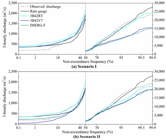 Moreover, the satellite-product-specific recalibration generally improves the discharge–duration curves in the high-flow section. Figure 10b shows that model recalibration effectively dampens the magnitudes of discharge underestimation at the quantile level higher than 50% for all SPP-forced simulations, except for the 3B42RT-based model run. The 3B42RT-forced model presents even more severe high-flow underestimation after recalibration (Figure 10b) than the situation that uses rain-gauge-calibrated parameters (Figure 10a). The 3B42RT-forced model presents a considerable overestimation of quite a few flood peaks in the calibration period under Scenario I (Figure 8a). Model recalibration that uses 3B42RT effectively reduces high flows in the calibration period and consequently decreases high flows for the entire period (Figure 8d). Notably, the satellite-precipitation-based model recalibration does not effectively enhance the low-flow simulations. The reason is probably due to the fact that the objective function for hydrological model optimization, the maximum of NSE tends to provide high importance to high flows, and thus the optimized model may not accurately simulate low-flow processes.