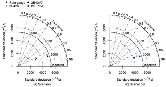Taylor diagrams of the simulated discharge comparison at the Monywa station using the rain-gauge-based precipitation data set, 3B42RT, 3B42V7, and IMERG-F SPPs based on the observed discharge data: (a) Scenario I and (b) Scenario II.
