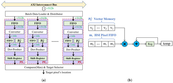 Multiple PEs work in parallel, which can efficiently accomplish dot-product operations of with each pixel in HSI. Moreover, a task-level pipeline structure is adopted in each PE. As described in Figure 2a, each PE first stores a pixel derived from batch Data Loader and Distributor into FIFO with bit-width of 512. Then, the 512 bits data in FIFO is split into single band pixel data by the converter and stored in FIFO with bit-width of 16. Finally, the inner product of pixel vector and in FIFO is completed by dot-product calculator, and the result is passed to the next stage through shift-register.