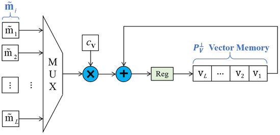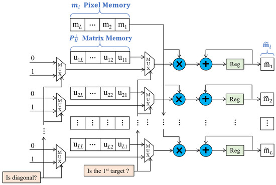 Figure 3 shows the specific hardware circuit of Sub-space Projector. This module, which has two inputs including the matrix from the Updater and the vector from the Target Pixel Loader, is used to calculate the product . It is worth noting that should be set to the identity matrix when the system is initialized. In order to improve the capability of parallel computation with fewer logic resources, L multipliers are allocated to realize the parallel matrix calculation.