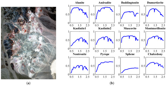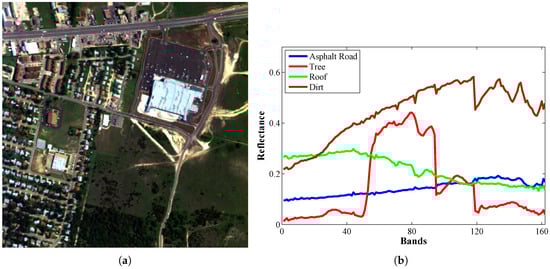 (a) False color composition of an HYDICE hyperspectral image collected on October 1995 over an urban area at CA, USA; (b) Four signatures: Asphalt Road, Tree, Roof, and Dirt.