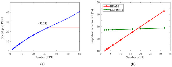 (a) The changing trend of the processing time speedup as the number of processing elements (PEs) increases; (b) The variation trend of resource utilization relative to the number of PEs.