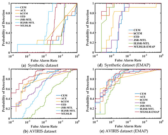 A good detection ROC curve should lie near to the top left. For the synthetic dataset, as shown in Figure 4a, the ROC curve of MTJSLR is above that of the other detectors, except for IEJSR-MTL. For other datasets, the ROC curve of the proposed algorithm is broadly above those of other detectors, especially when the false alarm rate ranges from 0.01 to 1. It should be noted that the ROC curve of ACE for EMAP in Figure 4d is unavailable because the inverse of the covariance matrix is ill-conditioned and unstable. Generally, it is observed that the ROC curve of each detector for the original spectral data is below that of its EMAP version.