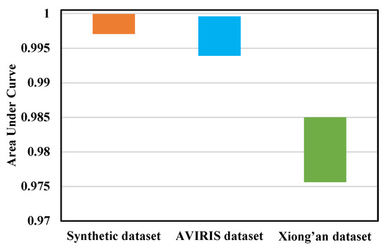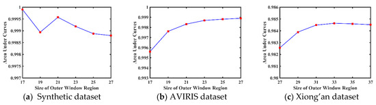 We further analyzed the performance of the MTJSLR-EMAP under the varying size of OWR. For the synthetic dataset in Figure 9a, the AUC value decreases at first and then increases at OWR=21. Finally, it keeps declining as the size of OWR increases. For the AVIRIS dataset, as shown in Figure 9b, the AUC value continues to climb as the size of OWR increases from 17 to 27. For the Xiong’an dataset in Figure 9c, the AUC value increases with the growing size of OWR and then would slightly decrease after reaching the maximum 0.9846 at OWR=33.