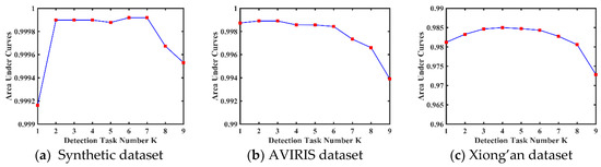 Figure 10 exhibits the sensitiveness of the MTJSLR-EMAP to the number of tasks . For the synthetic data set in Figure 10a, the AUC value increases at first and then gradually decreases with the growing K. For the AVIRIS data set in Figure 10b, the AUC value keeps a downward trend as increases from 1 to 9. As shown in Figure 10c, the AUC value increases at first and then would gradually decrease after reaching the maximum at . MTJSLR-EMAP performs the best for the first data at , while offers the best detection for AVIRIS and Xiong’an dataset when and , respectively. This experiments demonstrated that MTL detection is superior to the single task () detection.