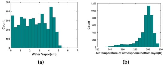 Histogram of water vapor (a) and air temperature of atmospheric bottom layer (b) of the selected Global Atmospheric Profiles from Reanalysis Information (GAPRI) atmospheric profiles.
