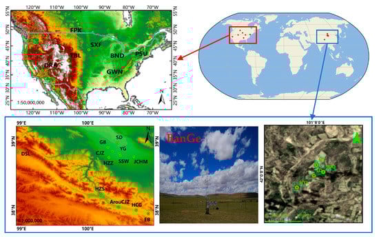 Distribution of Surface Radiation Budget Monitoring (SURFRAD) sites in the USA, Heihe Watershed Allied Telemetry Experimental Research (HiWATER) sites, and BanGe site in China.