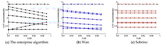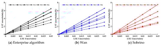 The LST uncertainty attributed to the water vapor content was primarily caused by incorrect selection of the TWV subrange. Assuming the error of TWV is 0.5 cm [46,64], the LST at a certain water vapor subrange can be retrieved using coefficients obtained from adjacent water subranges. The RMSEs of LST retrieval due to using coefficients of the adjacent TWV subrange are shown in Table 4. As shown in Table 4, the incorrect selection of the TWV subrange led to a significant increase in LST retrieval. For example, if TWV is equal to 2.8 cm, which belongs to a subrange of 2.0–3.5 cm, the RMSE of Wan, Sobrino, and the Enterprise algorithm are 0.570, 0.503, and 0.589 K. When coefficients in a subrange of 0.0–2.5 cm are used, the RMSE increases to 0.891, 0.795, and 1.057 K; when using coefficients in a subrange of 3.0–4.5 cm, the RMSE becomes 1.232, 0.851, and 1.207 K. It is worth noting that mis-classification of TWV led to a larger LST uncertainty in dry atmospheric conditions than in wet atmospheric conditions, e.g., in the previous example, the RMSE increased by 79.5% and 104.9% for the Enterprise algorithm. When TWV belongs to a subrange of 0.0–2.5 cm and the coefficients of a subrange of 2.0–3.5 cm were improperly used, the RMSE increased by 223.2%, 78.9%, and 186.3% for Wan, Sobrino, and the Enterprise algorithm.