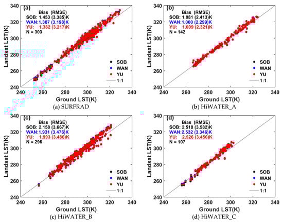 Scatterplots between ground-measured and Landsat LST estimated by three split-window algorithms. (a) the result of SURFRAD sites, (b) the result of HiWATER_A sites, (c) the result of HiWATER_B sites, and (d) the result of HiWATER_C sites. Sob, Wan, and Yu denote the split-window algorithm of Sobrino et al. [32], the general split-window algorithm, and the Enterprise algorithm.