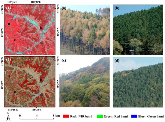 A comparison of color composites in leaf-on season (1) and leaf-off season (2) showing different representations of four tree species classes: birch (a) Chinese pine (b) a composite of different broadleaf tree species (c) and larch (d).