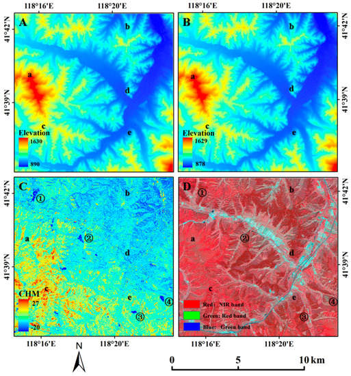 A comparison of the digital surface model (DSM) images from leaf-on season (A) and leaf-off season (B). The difference between DSMs was used to produce a relative canopy height (RCH) image, especially for a deciduous forest (C). As a comparison with the RCH image, a color composite (D) using the ZiYuan-3 multispectral image at the leaf-on season at the same site was provided (a: birch, b: Mongolia scotch pine, c: other broadleaf, d: Chinese pine, and e: larch). The blue color in locations ①, ②, ③, and ④ indicates deforestation sites of plantations between 2015 and 2017.