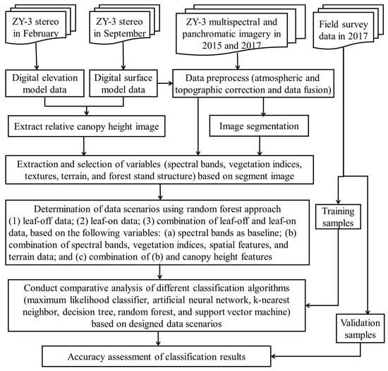 The framework of the mapping land cover, forest, and tree species distribution using ZY-3 data is illustrated in Figure 4. This framework includes five major steps: (1) data collection and preprocessing, (2) extraction and identification of variables from ZY-3 data, (3) selection of suitable classifiers, (4) design of classification scenarios and implementation of image classification corresponding to each scenario, and (5) validation of classification results.