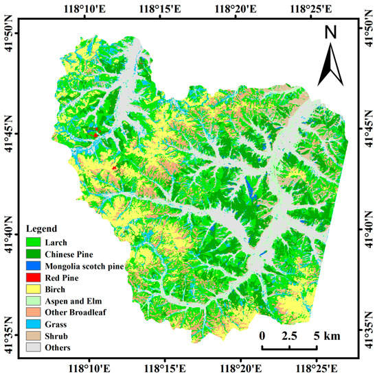 Figure 5 illustrates the land-cover classification result highlighting forest types using SVM based on spectral bands, vegetation indices, textures, and topographic factors from the combination of both seasons (i.e., V2both). Larch and CP are needle-leaf tree species that accounted for 26.8% and 13.5%, respectively, of the entire study area (Table 7), especially near roads and villages where people can access easily, while MSP and RP cover very little area, accounting for only 0.8%. Most broadleaf tree species are natural forests with birch and other broadleaf forests accounting for 15.1% and 7%, respectively. These tree species are mainly distributed in the southwest and southeast of the study area where elevation is relatively higher than where needle-leaf tree species occur. AAE is distributed mainly in the flat areas near villages and roads.