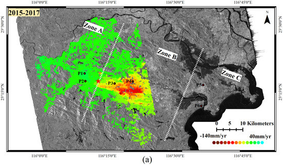 In Zone A, an uplift was observed in Puning. The mechanism behind this phenomenon is not known completely, although several possible explanations can be given based on the InSAR-derived time series, as well as meteorological and geological bases. As shown in Figure 11a, the temporal evolution of P1 and P2 contains linear and seasonal trends. The linear trend reveals a generally ascending continuous uplift: P1 with a rate of 13.86 mm/year from 2015 to 2017 and 10.76 mm/year from 2016 to 2018; P2 with a rate of 6.84 mm/year from 2015 to 2017 and 6.30 mm/year from 2016 to 2018. The seasonal response appears as a nonlinear oscillation, indicating subsidence and recovery. There are in total four stages of rebound which indicate elastic properties of surface motion change. The first, third and fourth rebounds occur after or around September, which is slightly before the rainy season in Puning. Both the points surge in the fourth rebound. This large rebound may have been caused by the Super Typhoon Hato, which induced strong precipitation in August 2017. As denoted in earlier studies, sufficient rainfall recharges groundwater and can lead to uplift of surface motion [42]. The first, third and fourth rebounds are most likely to be attributed to heavy rainfall during the rainy season. The second increase starts after February and ends before August, and the reason for this surface pattern is unknown. One potential explanation is that an earthquake hit Puning in February 2016. Although there is a general association between surface motion change and earthquakes, we still cannot determine the cause-and-effect relationship between the two.