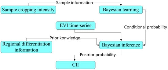 where  is the cropping intensity from sample data.  is the MODIS EVI time-series.   are prior information and are constants.  is the conditional probability of  given the cropping intensity, usually obtained through training.  is the posterior probability of cropping intensity given the EVI time-series. The calculation of posterior probability is the same as Equation (3).