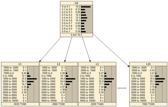 In the parameter learning stage, all variables were set to observed values, and the model was built at this level (forward). In the inference stage, however, the CII was set to unobserved, and the results of the inference were then taken as the estimated CII values (backward). For a given case, the posterior probability distributions of CII were calculated according to Equation (4):