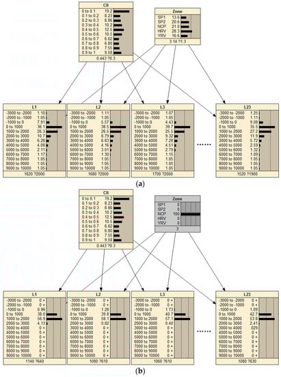 The BNPK model (Bayesian network fusing zone data as prior knowledge). SP1, SP2, NCP, HRV, and YRV represent the five sample areas. L1, L2, etc., represent the EVI time-series. (a) CPT when adding a zone node as prior knowledge. We simply assigned codes 1–5 to the five sample areas. After adding this node, all the CPTs in other nodes updated automatically. The intra-class variations on CII could be observed, which were consistent with the fact of regional differentiation. (b) CPT when giving evidence of zone information. If we provide evidence of zone type as NCP at 100% probability, all the child nodes update the CPT through the propagation of probabilities. This CPT is locally trained and exclusively for NCP.