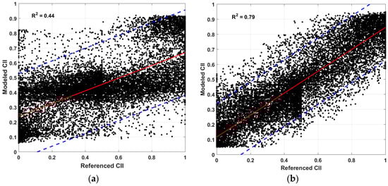 Trend line of the modeled and the referenced CII at pixel level, (a) BN model, and (b) BNPK model.
