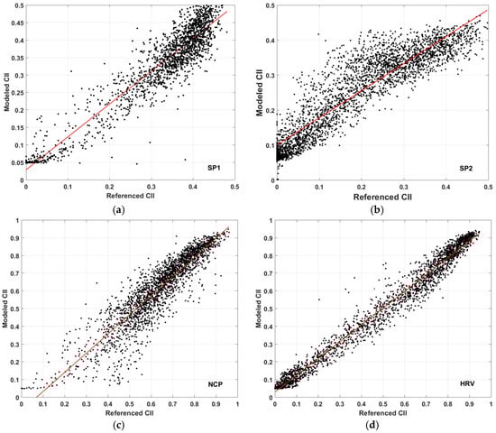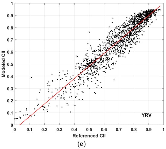 The coefficients of the simple linear regression between the referenced and the modeled CII at the block level are given in Table 5. For unbiased estimation, the regression line should approach the 1:1 diagonal line (intercept a ≈ 0 and slope b ≈ 1). Slope b was close to 1 and intercept a was relatively small, demonstrating the good fit of the regression.