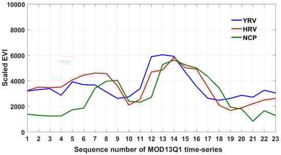 EVI profiles of the cropland pixels in three sample areas. About 100 representative pixels with a CII value of 0.7 were selected randomly for each sample area (using NCP, HRV, and YRV as examples), and the mean values of the EVI time-series were calculated to plot this figure.