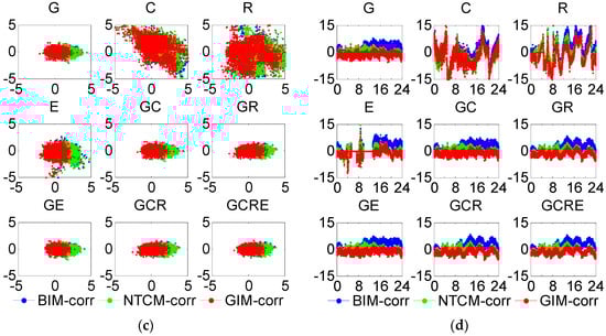 Positioning error scatters of b1 or b2 SPP with different schemes in nine different constellation combinations at station CUT0 (DOY 244/2018, Kp ≈ 0.92) (a) Horizontal error of b1 SPP (b) Vertical error of b1 SPP (c) Horizontal error of b2 SPP (d) Vertical error of b2 SPP. Horizontal error: the horizontal and vertical axes represent the error of the N and E component, respectively (unit: m). Vertical error: the horizontal and vertical axes represent the universal time (unit: hour) and the error of the U component (unit: m), respectively.