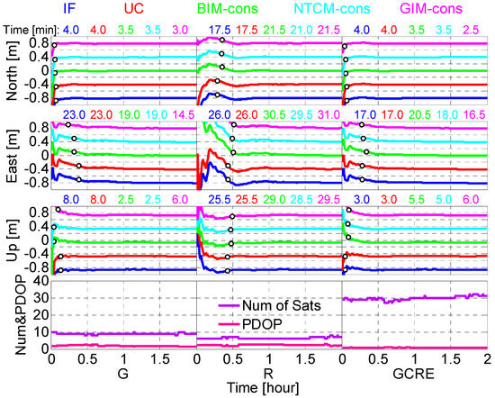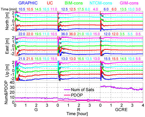 Figure 4 shows the comparison of b2 single-frequency PPP with different schemes for GPS, GLONASS and GPS/Beidou/GLONASS/Galileo solutions at station MR01 on 2 September 2018. The value errors of respective solutions are shifted by 1 m in order to avoid overlapping. For the single-frequency PPP approach, the positioning filter is considered to have converged when the horizontal components of the error reach 0.3 m and keep within 0.3 m. Because the vertical positioning errors are larger than the horizontal components, the criterion is enlarged to 0.5 m in the vertical direction. The convergence time for N, E and U components are also given and marked in Figure 4. It is obvious that the GRAPHIC and UC approaches have the same convergence time for GPS-only, GLONASS-only and quad-constellation PPP. Besides, the convergence time of ionosphere-constrained PPP solutions is less than the UC solutions at MRO1 for three schemes. The convergence time of the GIM-constrained solutions is the least for its highest model accuracy. The convergence time of quad-constellation single-frequency is reduced for the improvement of spatial geometry with more GNSS satellite compared with the GPS-only solution.