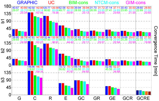 Figure 5 shows the average convergence time of b1, b2 and b3 single-frequency PPP with different schemes on all days over all the test stations. Table 5 summarizes the RMS errors of the single-frequency PPP in multi-constellation combinations, which is calculated from the convergence epoch to the end epoch of a day. The GLONASS-only and Beidou-only solutions clearly perform worse than other solutions, which is caused by the strong correlation between IFBs and slant ionospheric delays in GLONASS and the current distribution and orbit determination accuracy of the Beidou constellation [14]. The results also indicate that the integration of the multi-GNSS can improve the single-frequency PPP performance in terms of convergence time and positioning accuracy. As it is shown in Figure 5 and Table 5, the GRAPHIC and UC approaches have much the same performance for the equivalence of two solutions. By introducing external ionosphere information, the average convergence time of PPP solutions is reduced. For instance, the improvement in convergence time of BIM-, NTCM- and GIM-constrained quad-constellation b2 single-frequency PPP is 15.2%, 24.8% and 28.6%, respectively, compared with the UC solution. The positioning accuracy of the quad-constellation single-frequency PPP can reach 1–3 cm horizontally and 8–9 cm vertically. The improvement in the positioning accuracy of the ionosphere-constrained PPP, for giving higher weighting after convergence, was not significant. The positioning accuracy of the GIM-constrained PPP solutions is the best and NTCM-constrained PPP solutions perform better than the BIM-constrained solutions in the E and U components.