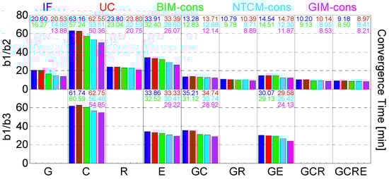 Figure 8 shows the average convergence time of b1/b2 and b1/b3 dual-frequency PPP with different schemes. Table 7 summarizes the RMS errors of dual-frequency PPP in multi-constellation combinations, the average values of all PPP tests after convergence are calculated. It can be seen that the b1/b2 based PPP performs better than the b1/b3 solutions. The performance of b1/b2 GPS/Beidou and GPS/Galileo PPP differs greatly from the b1/b3 solutions in that only GPS BLOCK-IIF can transmit signals on three frequencies. The positioning accuracy reaches approximately 0.5–2.5 cm in the horizontal and 2–5 cm in the vertical for dual-frequency PPP. Similar to single-frequency PPP, the combination of multi-GNSS speeds up the convergence process and improves the positioning accuracy. For instance, the convergence of quad-constellation b1/b2 GIM-constrained PPP is obviously improved by 40.6% from 13.88 to 8.21 min, compared with the GPS-only solution. The performance of the IF and UC PPP approaches are generally consistent for the equivalence of two models. Introducing different ionospheric models as constraints will reduce the convergence time of PPP schemes in different levels. We can see that the improving average convergence performance for GLONASS-only PPP with ionosphere constraints is the lowest compared with other solutions, where the performances of part stations like the results of Figure 6 may even deteriorate, which is primarily attributed to the existing GLONASS pseudo-range IFBs. The results for dual-frequency ionosphere-constrained GLONASS PPP achieved by [13] is slightly different, which is mainly attributed to different GLONASS code observation precision. In three ionosphere-constrained approaches, the GIM-constrained PPP has the best convergence performance and NTCM-constrained PPP performs better than the BIM-constrained solution. For quad-constellation b1/b2 PPP schemes, the improvement in the convergence time of BIM-, NTCM- and GIM-constrained is 5.2%, 6.2% and 8.5%, respectively, compared with the UC solution. A small but not obvious improvement can be seen in the positioning accuracy with the ionosphere constraint, mainly due to the relatively higher weighting after convergence. The GIM-constrained PPP has the best positioning accuracy in the different schemes.