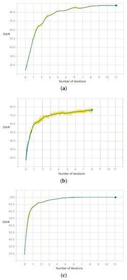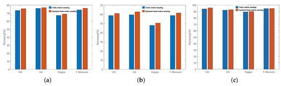 Classification accuracies of the designed layer-wise embedding CNN with totally random sampling strategy and superpixel-based random sampling strategy in (a) HSI data, (b) MSI data, (c) SAR data.