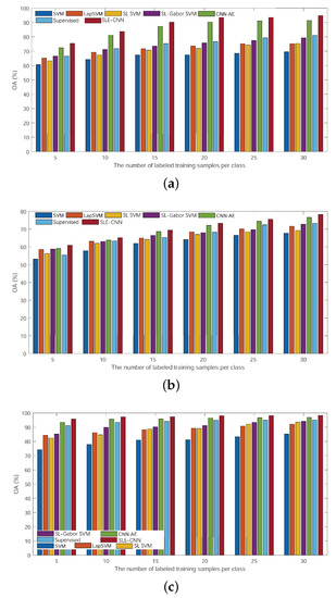 Also, we evaluate the performance of our designed SLE-CNN framework with the increase in the number of labeled samples and estimate its stability. We randomly choose 5, 10, 15, 20, 25 and 30 samples from each class as the labeled samples and the OA of above various methods is plotted in Figure 12, which shows that the classification accuracy increases as the number of labeled samples goes up and our designed SLE-CNN framework is superior to other methods when the same number of labeled training samples is chosen. Although the performance of different methods changes as the number of training samples changes, the designed SLE-CNN framework provides higher classification accuracies than other methods.