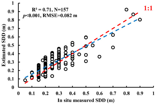 To verify the performance and accuracy of the SDD estimation model developed in Lake Taihu when used in Lake Hongze, we matched the 340 in situ SDD measurements with satellite data. To ensure that the time difference of satellite data and measured data does not affect the results, we chose to match the satellite transit ± 6 h as paired data. The pixels used the mean value of the 3 × 3 pixels surrounding each station to carry out comparisons between in situ and satellite data. After excluding the in situ SDD data without satellite matching data, we obtained 157 pairs of matched data to validate the SDD estimation model. SDD ranged from 0.10 to 0.90 m, with a mean value of 0.26 m, for the matching dataset (N = 157), and 0.05 to 2.00 m, with a mean value of 0.26 m, for the entire dataset (N = 340).