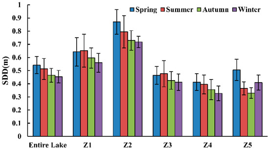 Seasonal mean values of SDD derived from MODIS data for five lake segments and the entire lake from 2003 to 2017.