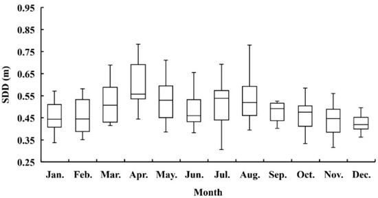 Boxplot of monthly mean variation of SDD derived from MODIS data for the entire lake from 2003 to 2017.