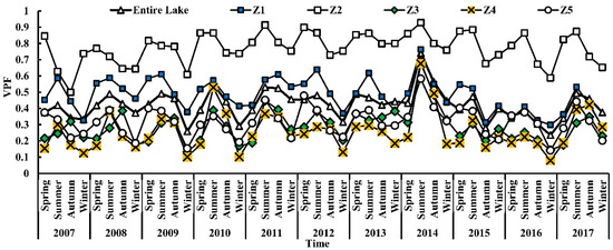 Time series of seasonal values of VPF for five lake segments and the entire lake from 2007 to 2017.