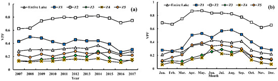 MODIS-Aqua derived VPF value of yearly (a) and monthly (b) for the five sub-regions and the entire lake from 2007 to 2017.