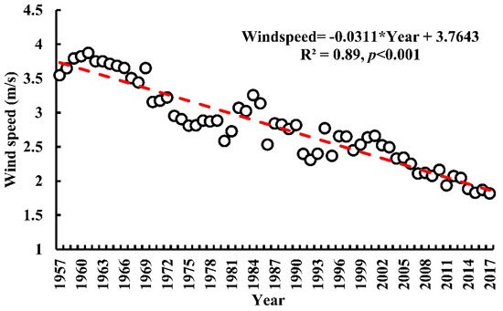 Long-term trend of yearly mean wind speeds in Lake Hongze during 1957–2017.