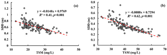 The sand mining activities of Lake Hongze began in 2007 when high-quality sand sources were discovered in the Huai River estuary; the sand mining vessels then quickly increased to more than 100 [34]. However, with the discovery of sand sources in other lake segments, the sand mining area spread rapidly to the entire lake, and by 2016 more than 600 sand mining vessels were observed on Landsat images [30]. Previous studies have found that sand mining activities rapidly increased TSM [30,33,37]. Then, 1785 high-quality images were applied to the model (Equation (1)) to obtain a TSM concentration dataset in Lake Hongze from 2003 to 2017. Therefore, the relationship between SDD and the TSM concentrations of the Z1 and Z4 lake segments with frequent sand mining activities were analyzed to explore the impact of sand mining activities on SDD. The results showed that the monthly mean SDD was significantly negatively correlated with TSM concentration in Z1 (R2 = 0.41, p < 0.001) and Z4 (R2 = 0.62, p < 0.001) lake segments (Figure 10). The marked correlation thus demonstrated that the decreased SDD could be explained by an increased TSM concentration caused by artificial sand mining activities.