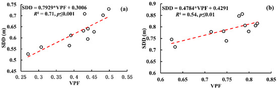 It is well known that many lakes are facing a decline in transparency and the area of global aquatic vegetation is decreasing [9,40]. SDD is the main environmental factor for the survival and growth of submerged aquatic vegetation seedlings. With a low value of SDD, the seedlings of submerged plants would die in large numbers due to insufficient light [38]. Therefore, SDD is an important parameter for limiting the growth and distribution of submerged aquatic vegetation. To better understand the interaction between aquatic vegetation and SDD, linear regressions between the average SDD and VPF were performed.